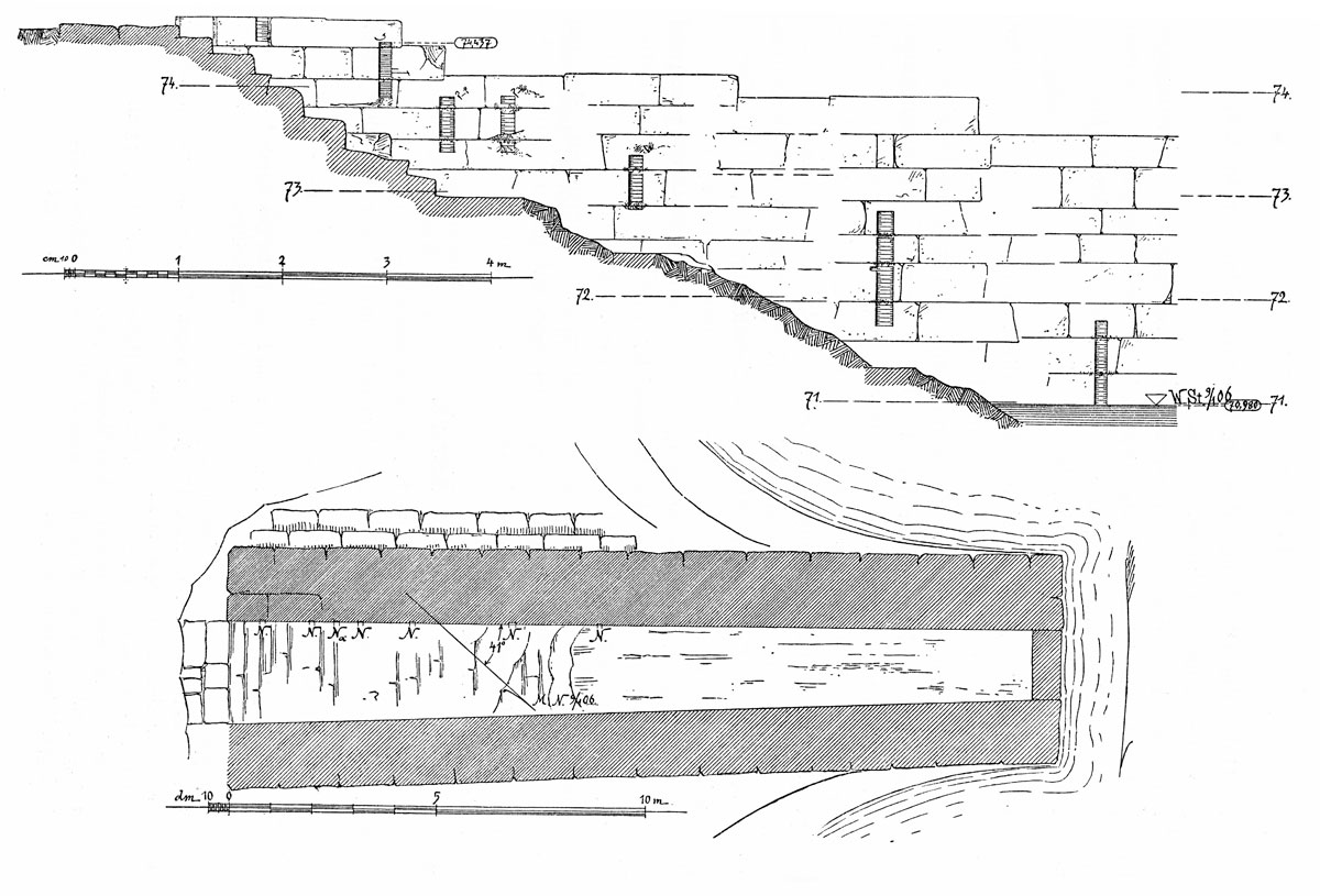 The Nile Quay Measure of Kubosch. Above, view in section. Below, ground plan of the left portion. (As it was in 1896.)