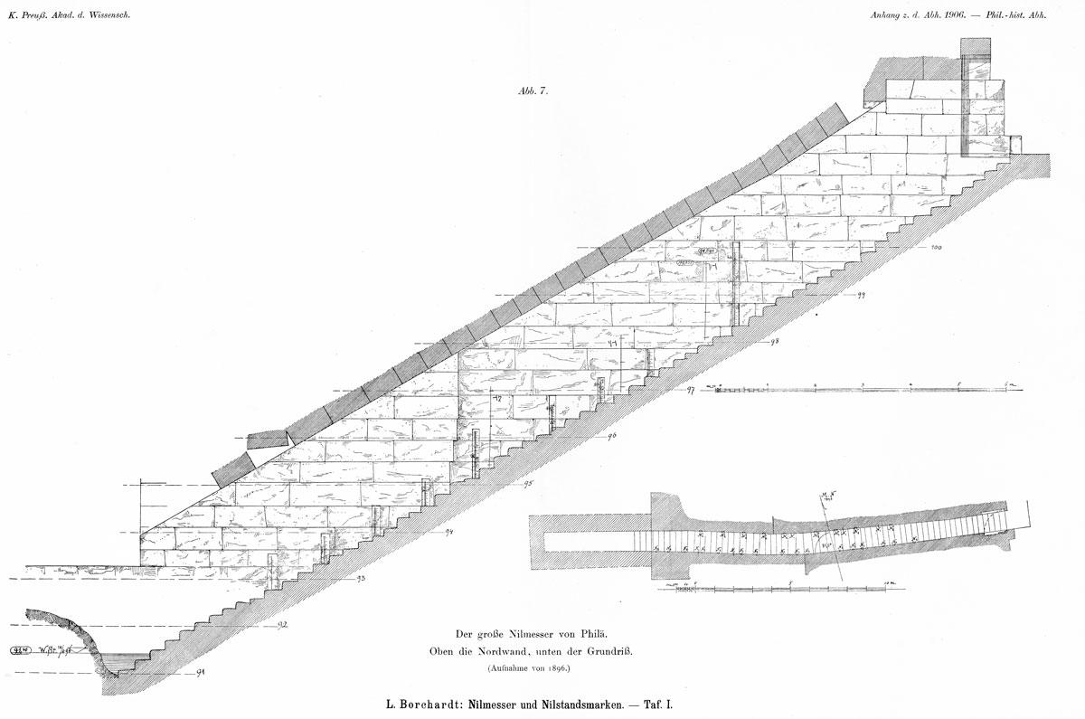 In 1906 Ludwig Borchardt published his comprehensive book Nilmesser und Nilstandsmarken (Nile Gauges and Nile Level Markers) (Berlin, Royal Academy of Sciences, 1906, 55 pp.). It contained 37 illustrations plus 5 folding plates at the rear. The photos in the book are of relatively poor quality, but the drawings are of excellent quality, and show the nilometers and measuring-quays with the greatest precision of measurement. Some of these no longer survive and, since the construction of the Aswan Dam, are now beneath Lake Nasser. And the nilometer of Philae, which does survive, has of course been moved to a different location, so that it is no longer in situ as shown in Borchardt’s book. In the interests of making all of this illustrative material available freely to all scholars, the Foundation’s copy of this book has been used to produce high resolution scans of all the illustrations, which are available in the image library below. The captions to all of the illustrations have been translated into English. A scan of the text of the entire book, including the illustrations in lower resolution, is available here as a pdf download. Further material concerning nilometers will also be added to the website from time to time.