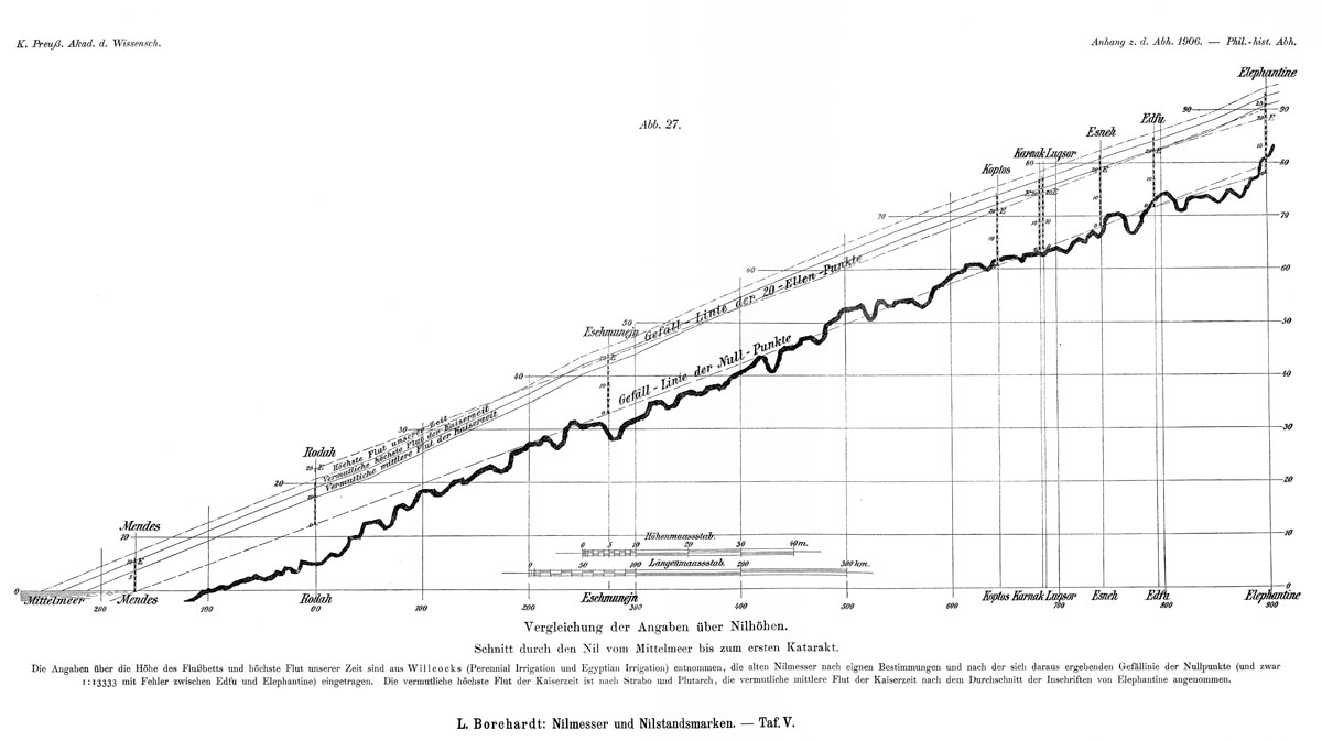 Collation of the data concerning the Nile heights. Section through the Nile from the Mediterranean to the First Cataract.